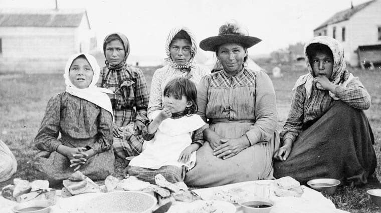 pg.10 Women and children [of Brunswick House First Nation] at the feast during Treaty 9 payment ceremony at [the Hudson’s Bay Company Post called] New Brunswick House, Ontario.